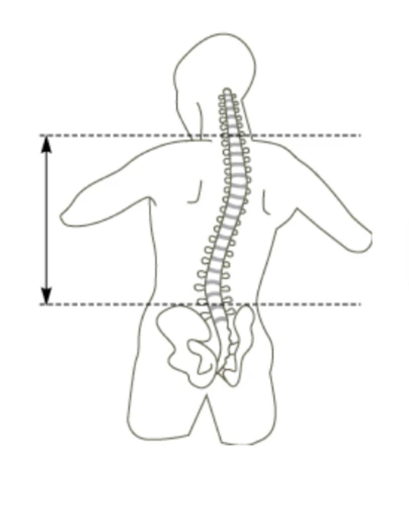 Measure from the top of your hip bones (iliac crest) up to the C7 vertebra (the bony bump at the base of your neck). Use this measurement to choose the right size.